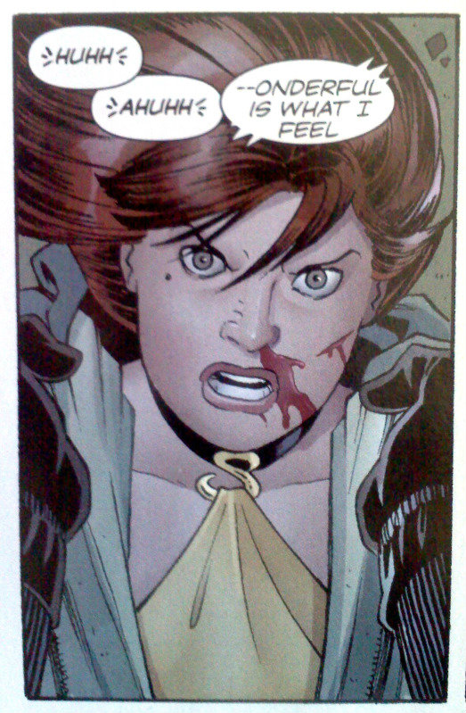 From: Ken Kirste (kkkirste sbcglobal.net) Within the conventions of comic book lettering, crow's feet describes the marks used to indicate a human sound that accompanies the in-taking or expelling of air. Also called breath marks, they are usually three small dashes stacked vertically (and at slight angles) on each side of the sound that the character is making (such as a whew, gasp!, cough, sputter). Here's a panel from the "Silk Spectre" comic book showing the use of crow's feet in a dialog balloon.