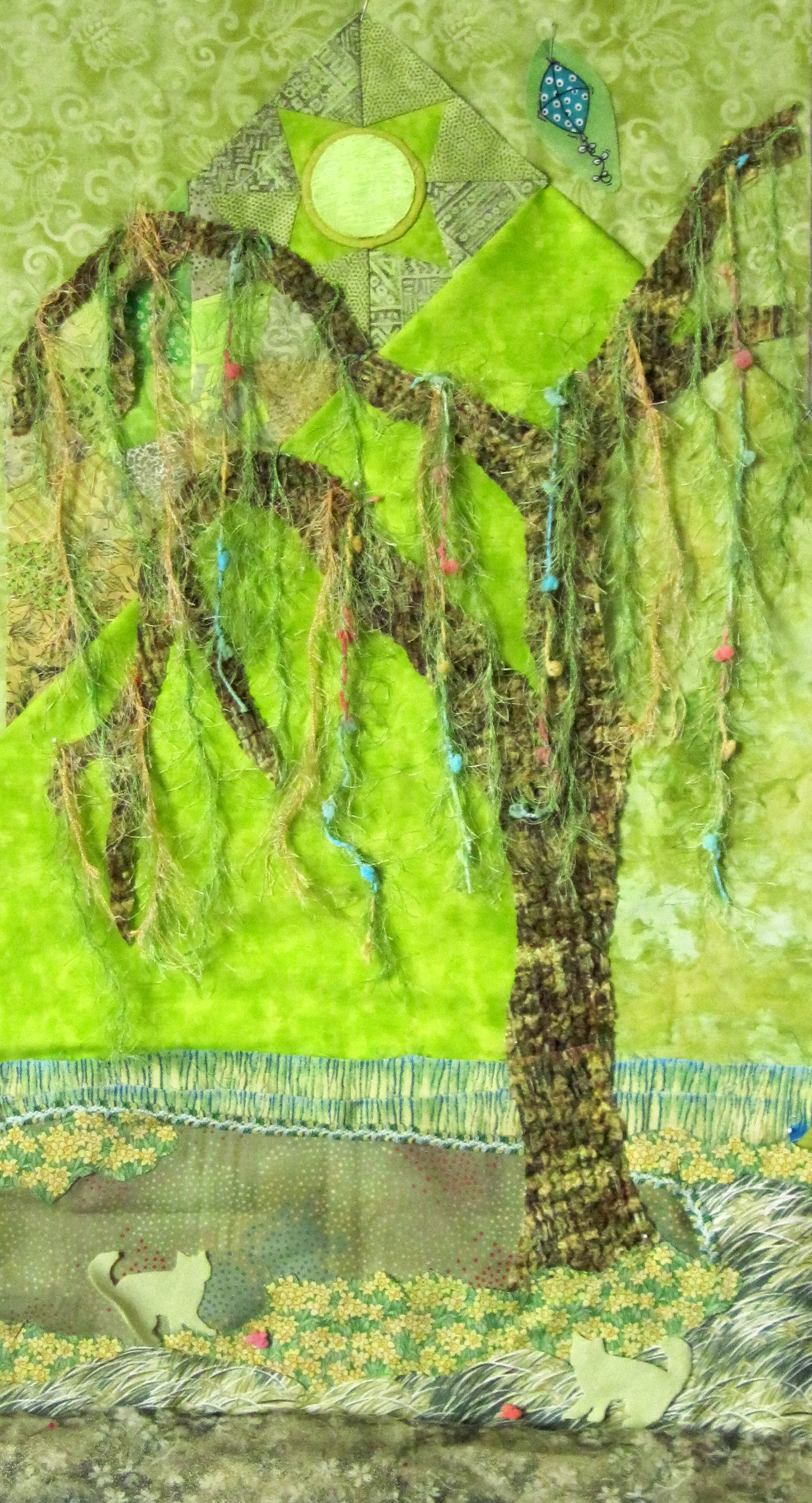 From: Kathryn Kaser (kkaserco dwwireless.net) This reminds me of a psychological parlor game we used to play. You are asked the question: What is your favorite color?, then to use three adjectives to describe it . My first reaction was, How can I choose; I love them all. Then I settled on chartreuse with the thought that I love the way it rolls off the tongue. My three words were "bright, sharp, natural", only to find out that that is what I think of myself. :) I belong to a group that challenges us to make art quilts with different sets of rules. For the March 2012 show we each picked a color and made a 16" x 30" quilt that had to "read" that color. Here is mine, a whimsical willow tree to memorialize one I used to drive past on the way to work every day.