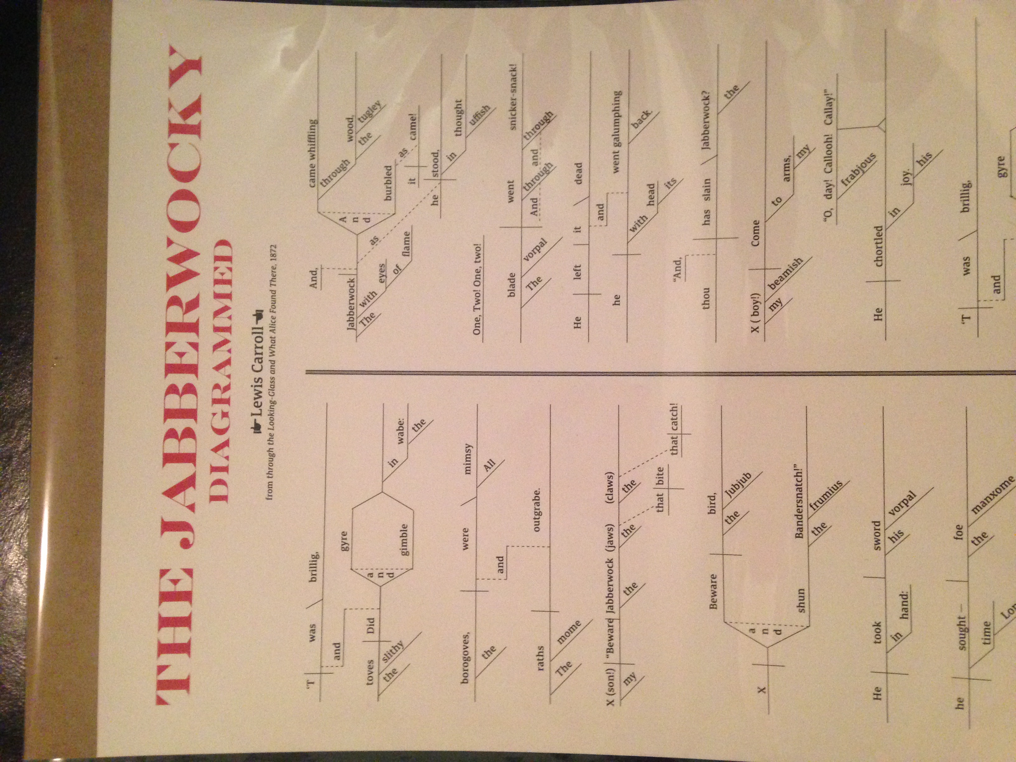From: Kimberly Cohn (kimberlycohn icloud.com) Subject: ‘Twas brillig! Thank you for this week’s words! My seven-year-old and I have loved seeing which new word would appear each day as we have long been fans of the poem, especially the book with Graeme Base’s renderings. Curious if you have seen this sketch of the Jabberwocky diagrammed? I love it and can’t wait to get it framed!