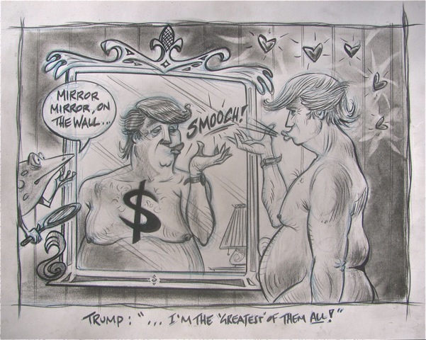 From: Alex McCrae (mccrae7474 roadrunner.com) Ancient Greek mythological figure, Narcissus, fell in love with his own reflection in the mirrored surface of a pond. Sigmund Freud, as was his inclination, in deriving much of his novel psychoanalytic-speak from ancient myth and legend, coined his clinical term narcissism. Donald Trump clearly exhibits most of the telltale traits of the classic narcissist. Hmm... even the good Dr. Freud would have been impressed... or might that be... depressed?
