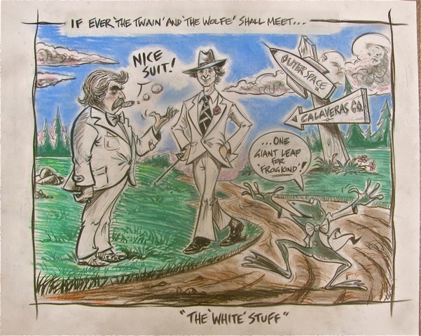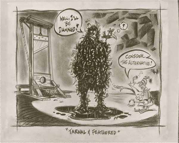 “I wear this raiment while working at my desk.” Tom Wolfe; My Favorite Thing; Esquire (New York); Sep 2016. I’m guessing that in our “raiment” USAGE quotation from the novelist Tom Wolfe he was referencing his now-signature tailored three-piece white suits that he often sports, projecting the stylish persona of the uptown, urbane literary dandy. So happened that Mark Twain had a penchant for often wearing white suits, as well. So in captioning this week’s little cartoon ditty “The White Stuff”, I’m spoofing the title of Wolfe’s The Right Stuff, his chronicling the heroic exploits of our courageous NASA astronauts, here reflecting on authors Wolfe, Twain, and my little jumpin’ tuxedoed froggy character... all sartorially decked out in pure white raiments. My jaunty cartoon frog has assumed the guise of Twain’s famous jumping frog of Calaveras County, who has borrowed a portion of Apollo-11 astronaut Neil Armstrong’s memorable moon-landing declaration... with an obvious reptilian twist. Back in the day, tar-and-feathering was a not uncommon form of corporal punishment for those deemed to have broken the law of the land. The ultimate fate of the tarred-and-feathered “victim” wasn’t necessarily banishment to eternal damnation... tarnal; yet the stigma of enduring such a severe act of public humiliation and physical pain would surely have left its impress.