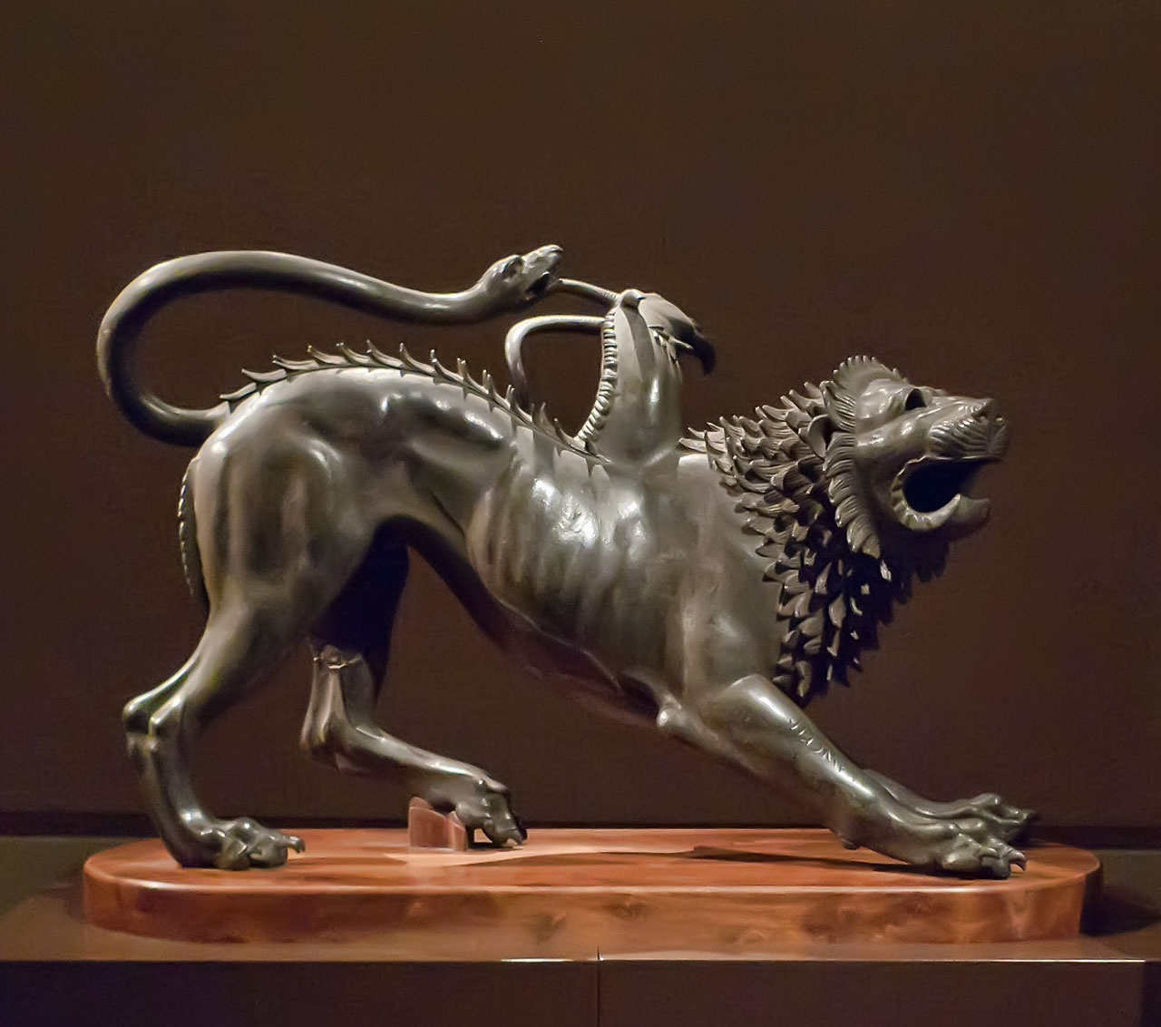 a lion's head, a goat's body, and a serpent's tail. From Greek khimaira