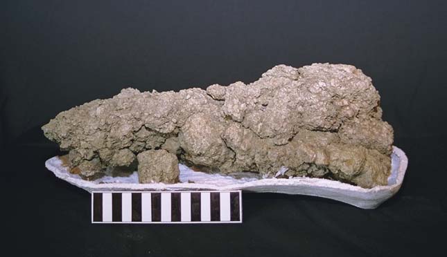 A coprolite of a carnivorous dinosaur, found in Saskatchewan, Canada. (actual size: about 1 foot)