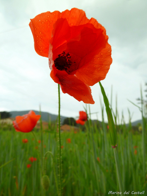 From Old French pouncel (poppy), diminutive of paon (peacock), from Latin