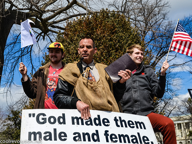 A sackclothed man in front of the US Supreme Court, protesting against the gays.