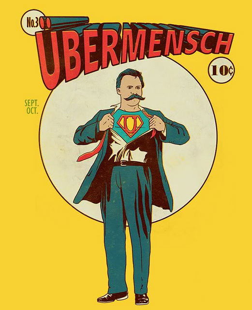 From German Übermensch (superman), from über (over) + Mensch (man). In Nietzschean philosophy, an Übermensch